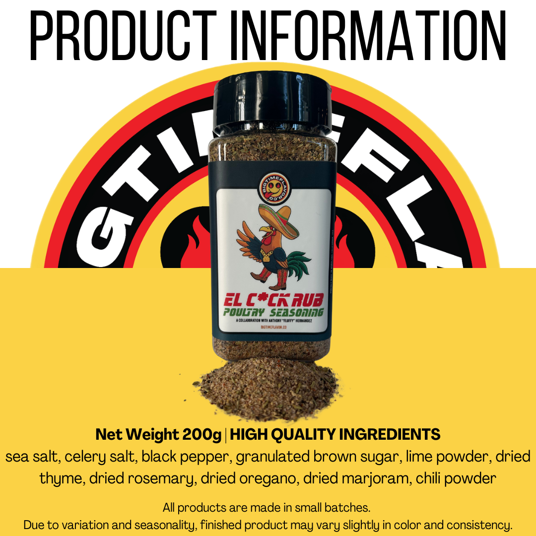 El Cock Rub is a bold seasoning blend that pays homage to Hernandez and his combed counterpart. It is perfect for any poultry dish as a seasoning or base for a marinade. It also is, ironically, an incredible addition to pico de gallo. Stick your beaks out and fight for more flavor in this mundane world with El Cock Rub.